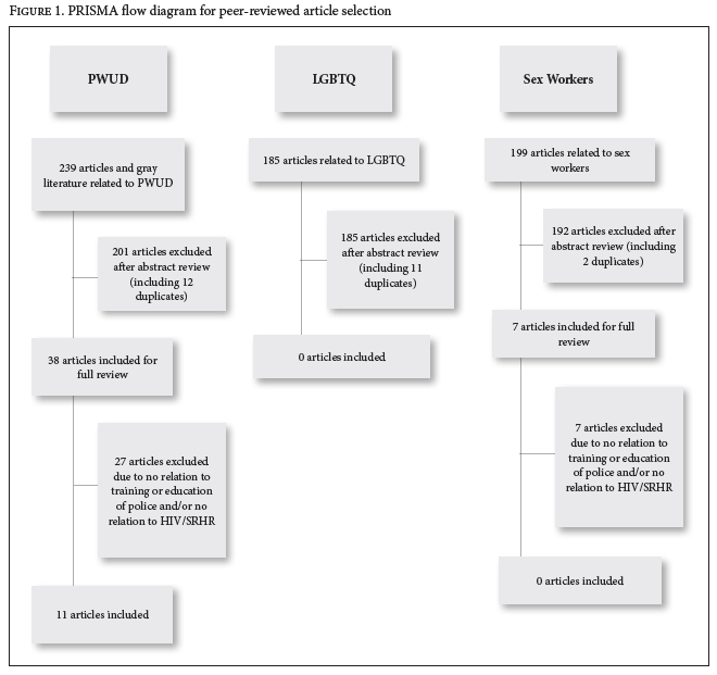 Our review identified a broad diversity in the focus and objectives of police training interventions implemented between 2011 and 2023. Notably, articles on police training published in peer-reviewed literature almost always addressed people who use drugs, while those identified from the gray literature included a broader range of populations, including people who use drugs, sex workers, and LGBTQ populations. Most programs were conducted for active police officers (in-service training); however, training in Ghana, Kenya, and Senegal described combinations of pre-service training (institutionalized through police academies) and in-service police education programs.[13]