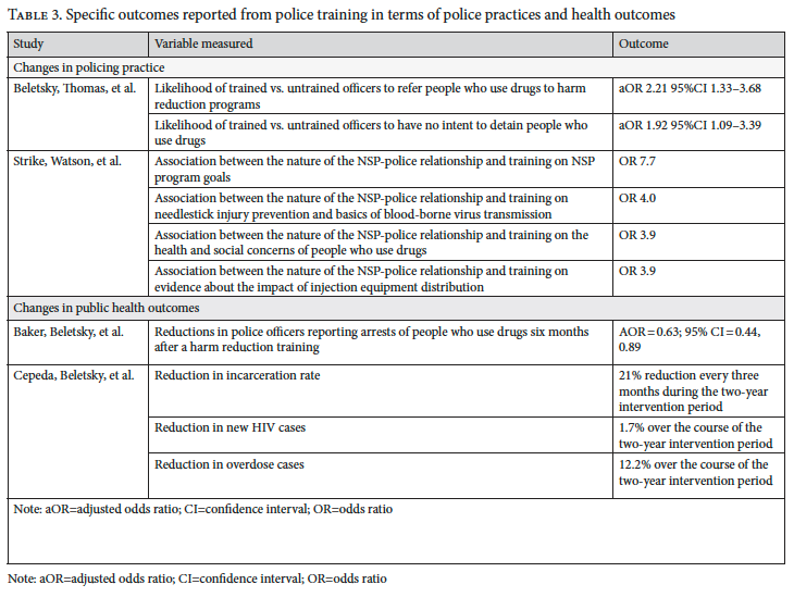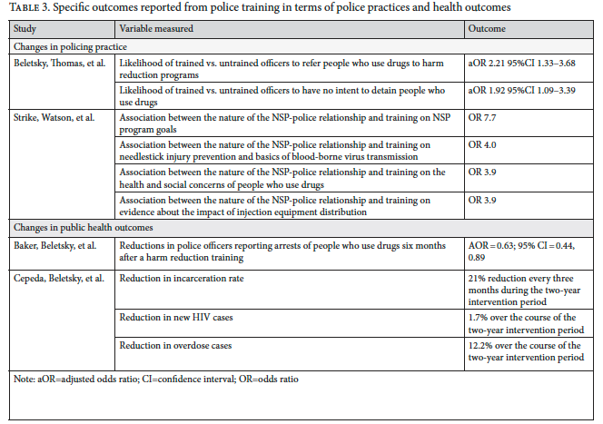 Several studies looked at changes in policing practice following training interventions. A study in Canada, for example, found a positive association between, on the one hand, good relationships between NSPs and police departments and, on the other, in-service training of police on NSP goals and harm reduction.[27] A survey of syringe exchange providers in the United States found that these providers saw police training as key to improving their relationship with police.[28] Another study found that correct knowledge related to HIV, the law, and injection drug use was associated with significantly lower odds of reporting arrests among people who use drugs.[29]