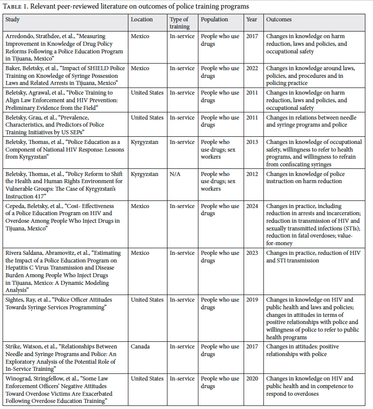 Peer-reviewed and gray literature reports on police training programs found similar outcomes, including positive changes in knowledge related to harm reduction, relevant laws and policies, and occupational safety practices. Less commonly reported outcomes included changes in relations between needle and syringe programs (NSPs) and police; willingness to refer people who use drugs to health programs and willingness to refrain from confiscating syringes; and changes in practices, including reduction in arrests and incarceration, reduction in transmission of HIV and STIs, and reduction in fatal overdoses. Some studies also calculated the value-for-money of training programs.