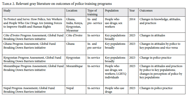 All of the peer-reviewed articles identified focused on police training programs for people who use drugs and sex workers; none concerned MSM or transgender populations (Table 1). In the gray literature, we identified six other publications, five which were published as a part of evaluation studies of countries participating in the Global Fund’s Breaking Down Barriers initiative and one by the Open Society Foundations (OSF) (Table 2).